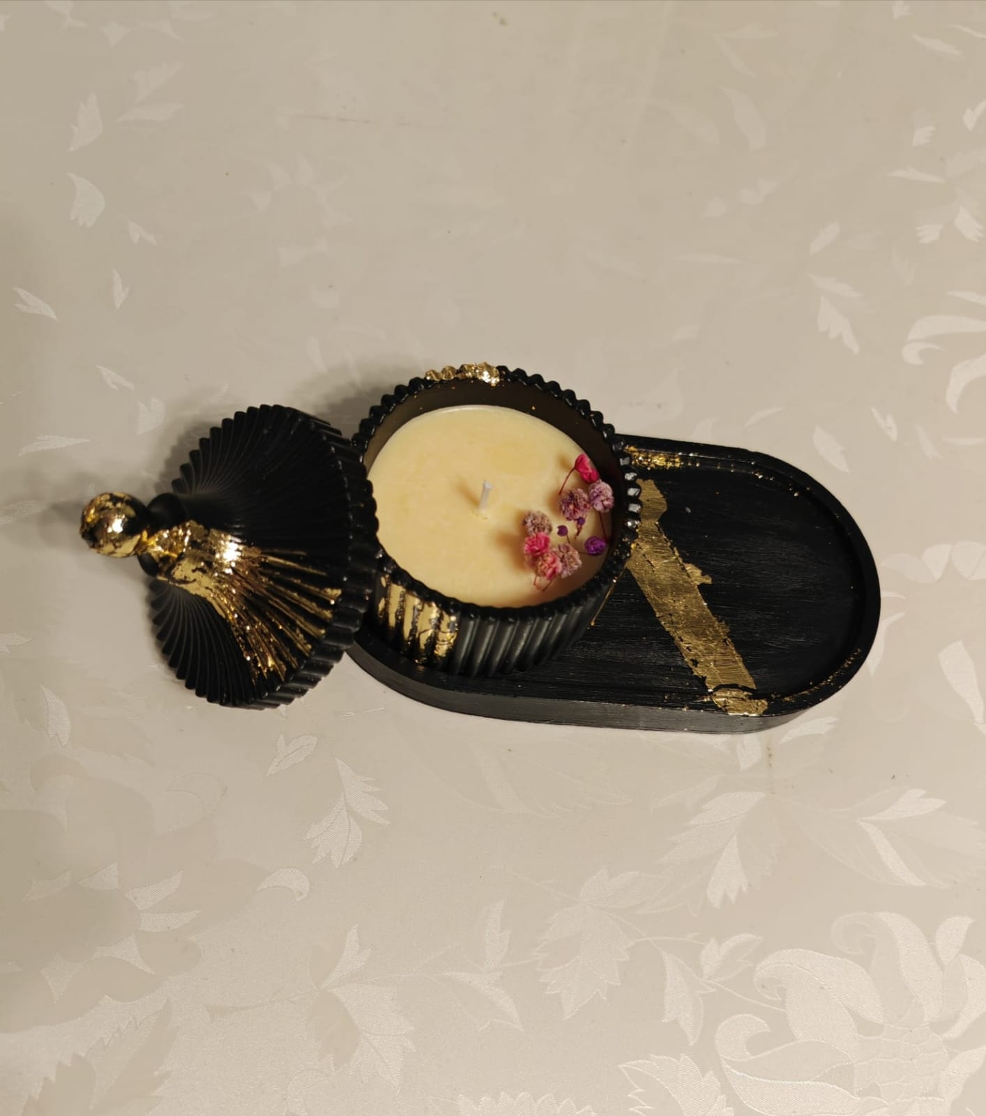 Caracteristici: Ceară 100% naturală de soia. Parfum de înaltă calitate. Flori uscate, naturale. Fitil din bumbac 100% organic. Produs realizat manual. Ardere curată și ecologică, fără emisii de substanțe toxice. După consumarea cerii, vasul se spală cu apă și săpun și poate fi utilizat pentru depozitarea bijuteriilor, ca bombonieră etc.